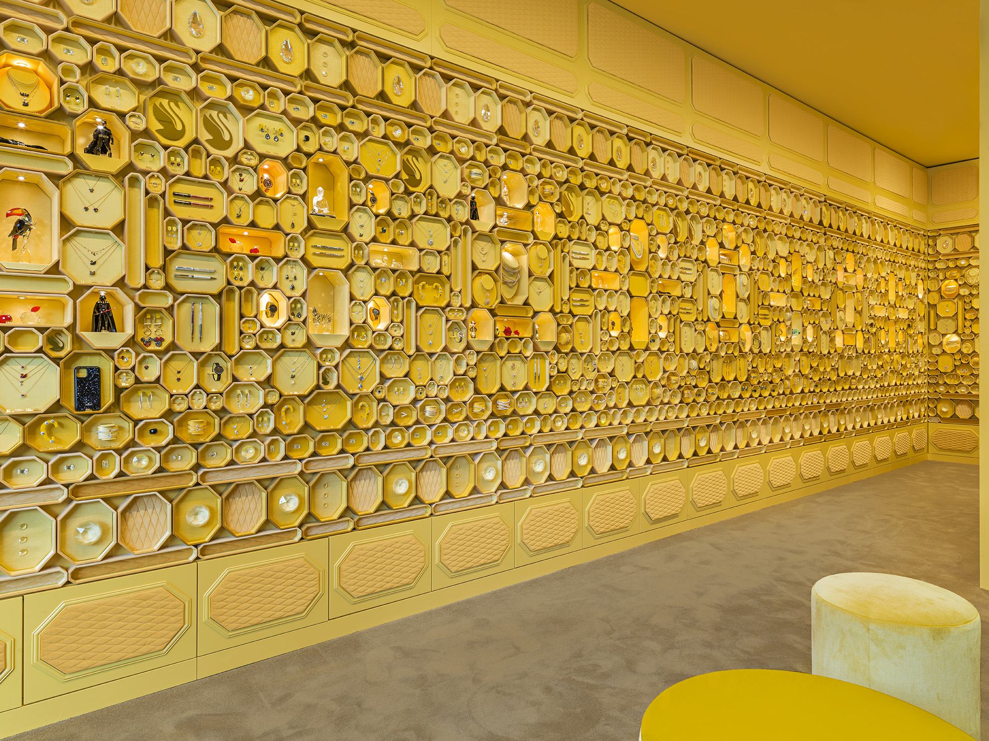Though one facet of many in the brand’s relaunch, the covetable new boxes play a key role in bringing Instant Wonder stores to life. Each store is represented by one of five colors – white, pink, green, blue, and yellow – that are, in turn, inspired by the prismatic result of light shining through crystal. Walls are lined from floor to ceiling in the octagonal boxes to create a monochromatic, repeating motif that encourages exploration.